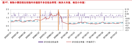 从做多大票做空小票的多空组合净值曲线来看,2006年之前和2010年之后多空组合净值基本是围绕某个值上下波动,只有2006年-2008年11月之间多空组合净值明显上升,大市值股票相比小市值股票有明显的超额收益,金融危机发生后2008年11月之后-2010年之间多空组合净值出现大幅回撤,市值因子出现反转,小市值股票相比大市值股票有明显的超额收益。