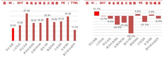 但从国际比较来看,香港市场仍具有最低估值水平,可谓最便宜资产。其中标普500指数2017年底的PE为24.56倍;亚太地区另一金融中心日本的日经225指数PE达到了19.52倍。