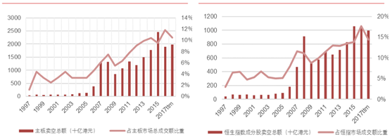 总体来看,香港对于卖空交易的监管制度较为成熟严格。2000年以来,港股主板卖空总额占市场总成交额的比例不断增加,2016年港股主板卖空交易达到1.9万亿港币,占市场总成交额的比例已达到11.8%。2017年前三季度港股主板卖空交易已达1.6万亿港币,占市场总成交额的比例平均10.5%。