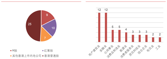 从恒生指数的股份类别比重来看,香港普通股和中资股各占一半,可见中资股在港股中的地位可见一斑。从行业比重来看,地产金融这两个香港传统优势行业各占25%。