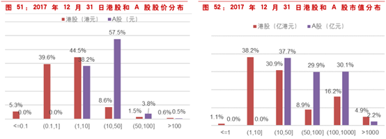 而A股中股价最小的股票也大于11元。从A股和港股的各市值组内股票数量的分布情况也可以看到,港股于总市值小于10亿港币的公司数量约占40%,而A股最小市值也有有9.58币亿人民币。