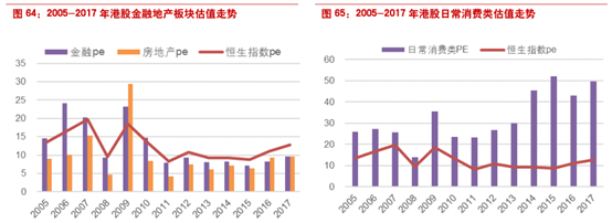 2.三个市场中港股中估值最高的版块有11个:日常消费类。日常消费类板块历年来在港股市场上的估值水平均高于市场平均值。