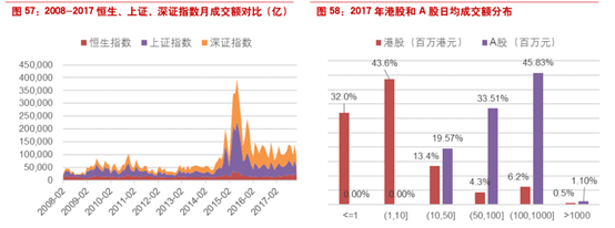 港股中僵尸股众多::对于港股个股的成交额情况,从2017年港股和A股的日均成交额分布情况可以看出,除了已长期停牌或新上市的的股票外,港股市场中日均成交额最小的(SHANGHIAGROWTH)不到11万港元,小于10万港元的有58只,百万港元以下的多达665只,约占全市场的32%,日成交额在千万港元及以下的股票数量占比约为77.6%,而日成交额在一亿港元以上的股票数量占比仅为6.7%。而A股市场中并没有出现成交额在千万元以下的股票,有最小的也有1495万元(康达尔),日成交额在一亿元以上的股票数量占比为46.9%。