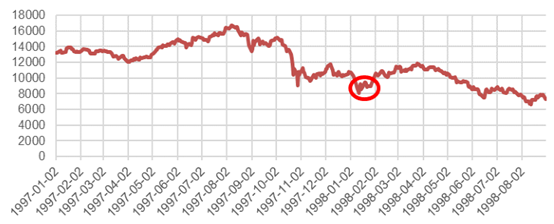 第二阶段:1998年初,印尼金融危机爆发,受其影响,东南亚汇市随之崩塌。随着日元的大幅贬值,国际金融形势更加不明朗,亚洲金融危机继续深化。香港恒生指数在1998年1月12日再次跌破9000点,跌至8121点的历史低位。