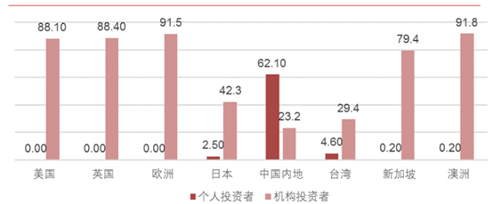 在海外投资者中,机构投资者占主导地位,并且比例在上升,2016年达到82.76%,而海外个人投资者占比在下降,2016年仅为17.24%。值得注意的是,来自英国、美国、新加坡的港股市场投资者均以机构交易者为主,以上三地机构投资者交易的最低比重分别为88.4%、88.1%和79.4%。然而,中国市场投资者以个人投资者为主,内地机构投资者交易最低比重仅为23.2%,个人投资者交易最低比重达到62.1%。(根据港交所发布的报告上面的解释,最低比重相加不等于100%的原因是有部分交易分类不确定,可能来自于个人,也可能来自于机构)