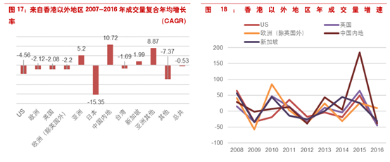 从复合增速来看,来源于内地的成交量增速最大,,2007-2016年这九年间复合增速达到10.72%,而同期多数地区复合增速为负值,来自香港以外地区总成交金额年增长率仅为-0.53%。从年成交量增速情况来看,来自中国内地的成交金额在2015年飙升,年增长率达到185%。如果不包括2015年的数据,中国内地市场2007-2016CAGR仅为-1.63%,但相比其他地区复合增速仍然较高。