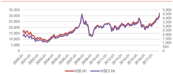 从数量占比上看,截至12月31日,香港市场共有上市公司2150家,合计总市值67.7万亿港币。中资股合计数量占比46.97%。从市值占比上看,中资股合计市值占比47%。需要注意到的是,实际上这还是仅以港交所官方数据为口径,并不包括其它业内机构算入的中资民营股(即注册地在香港,多数业务开展在内地的中小型民营企业),如果将其也计入统计,更加广泛意义上的中资股市值占港股比例已经超过60%。可见中资股已经成为港股的中流砥柱。对比1997年的港股市场,中资股数量在港股的占比仅为6%,市值占比仅为16.29%。如果将1997年中资股市值与2017年对比,在不考虑汇率因素的情况下,后者为前者的将近22倍。可见02000年之前香港经济是港股的主要驱动因素,02000年起由于大量中国公司在香港上市,中国经济增长已经成为决定港股走势的核心要素。