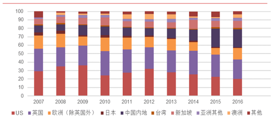 从近些年海外投资者来源地分布来看,在过去10年中,美国和英国投资者合计占比始终高于40%。这表明港股市场的主要海外投资始终还是来自于欧美。但是应该注意到的是长中国内地投资中的的占比正在加速增长,从2007年的8.2%大幅提升到2016年的21.6%。尤其2014年沪港通开启后,中国内地投资占比更是有了明显的提高。