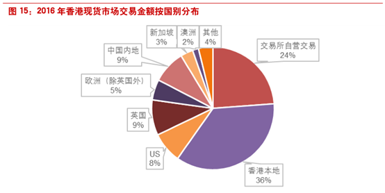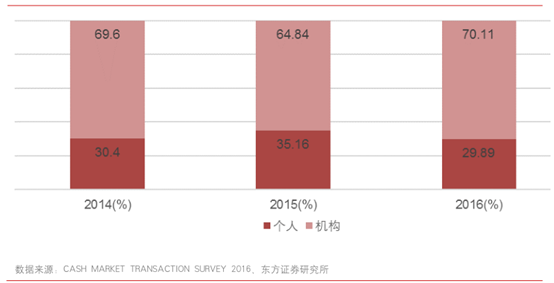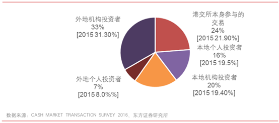 从交易金额来看,2016年外地机构投资者依然是占比最大的部分,占到33%。海外机构投资者和本地机构投资者占比较2015年均有回升,机构投资者比合计占比53.4%。其次是交易所参与者本身的交易为所占的比重,占比为24%,创历史新高。