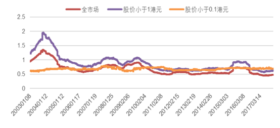 由于仙股的涨跌幅与市场本身的涨跌有很大关系说明,因而单纯看涨跌幅情况,不够全面,我们将仙股和全市场股票过去250个交易日的滚动波动率进行了对比,结果显示小于1港元的仙股波动率始终高于全市场,并且2002-2003年市场对股价小于1港元的仙股的炒作明显,近些年明显收敛。而对于股价小于0.1港元的股票波动率变动不大。