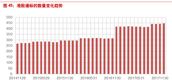 自从港股通开放以来,港股通标的数量随着时间逐步增长。截止2017年12月31日,港股通的标的数目为446只。全部陆股通1480只,其中沪股通576只,深股通904只,根据2017年每月的港股通和陆股通成交金额,可以看出互联互通市场规模不断扩大,2017年全年港股通成交金额为226万亿港元,全年陆股通成交金额为183万亿人民币。