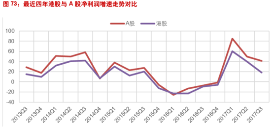 从整个港股和A股的净利润增速走势来看,港股和A股盈利趋势一致。