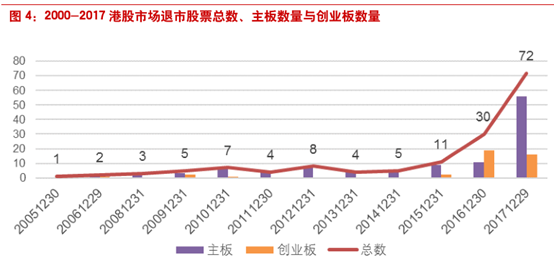 可以看出,港交所没有规定明确量化的退市机制和摘牌标准,一切按照市场规律行事。这种退市制度导致的后果就是港股市场退市率极低。很多股票在基本面恶化后股价可以跌到1块钱以下,也几乎没有成交量,但仍不会退市,的大量的“仙股”、“僵尸股”长期滞留在市场中。根据本报告第五部分的统计,截止2017年12月31日,港股中收盘价小于等于1港元的股票多达953只,占比为44.9%。2017年日均成交额在百万港元以下的股票多大665只,占比为32%,
