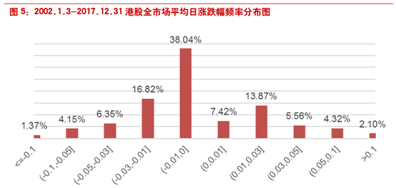 A股市场有涨跌停板制度,而香港市场不存在涨跌幅限制,而且可以T+0交易。我们统计了从2002.1.3-2017.12.31年香港市场所有股票的日涨跌幅,绘制了平均日涨跌幅的频率分布图。平均而言日跌幅在1%以下的股票数量最多。