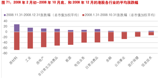 我们发现(9,1)动量组合的多空组合收益率最低点出现在2008年11月底。因而我们统计2008年2月初-2008年10月底港股各行业的平均涨跌幅,和2008年12月的平均涨跌幅。通过对比可以明显看出,在动量形成期阶段收益率较高(跌幅较小)的行业例如医疗保健、公用事业等在持有期收益率反而很低,而在动量形成期阶段收益率较低(跌幅较大)的行业例如原材料、工业、地产等在持有期收益率反而很高。这就导致了做多形成期跌幅较小的股票,做空形成期跌幅较大的股票将获得极低的收益率。
