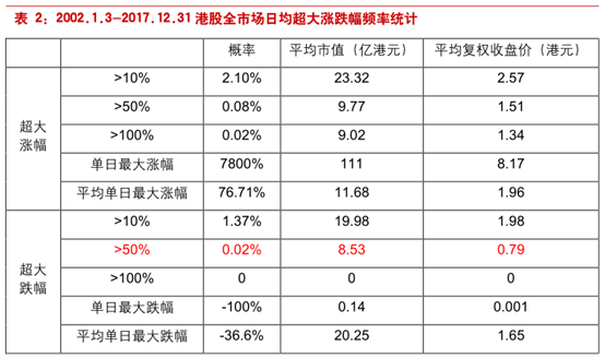 进一步我们想知道是否超大幅的涨跌仅在小票中出现,我们计算了每日涨跌幅超过10%、50%和100%的股票的平均复权收盘价,可以看出超大幅涨跌基本均出现在一港元以下的小票中。尤其是超过50%暴跌更是大概率会出现在小于0.1港元的仙股中。