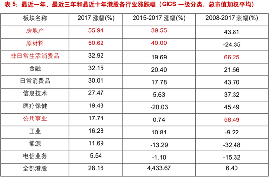 我们对比了最近一年、最近三年和最近十年港股各行业股票的涨跌幅。从涨幅情况来看,过去三年均是原材料和房地产行业领涨,二者2017年涨幅均超过50%。其次是金融、日常消费品和非日常消费品,三者2017涨幅均超过30%。