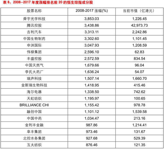 我们也统计了从2008年1月1日-2017年12月31日十年时间恒生综指成分股的涨幅及基本面情况。在这里我们只列出涨幅排名前20的股票,由于总体结论与前文所述基本一致,考虑到篇幅原因这里就不展开论述了。