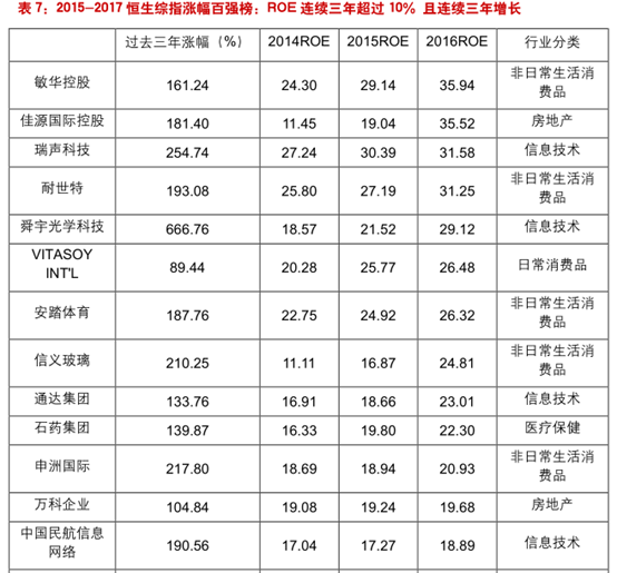 我们列出了恒生综指中中2017年涨幅前十名的股票及当前的最新市值以及2016-2017年的ROE和净利润同比增速。