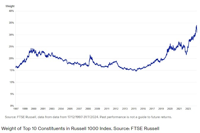上个月,罗素1000指数的前10大成分股——主要是科技股——占该指数的34%。虽然这还没有达到25/5/50的水平,但这是该指数45年历史上从未见过的集中度。