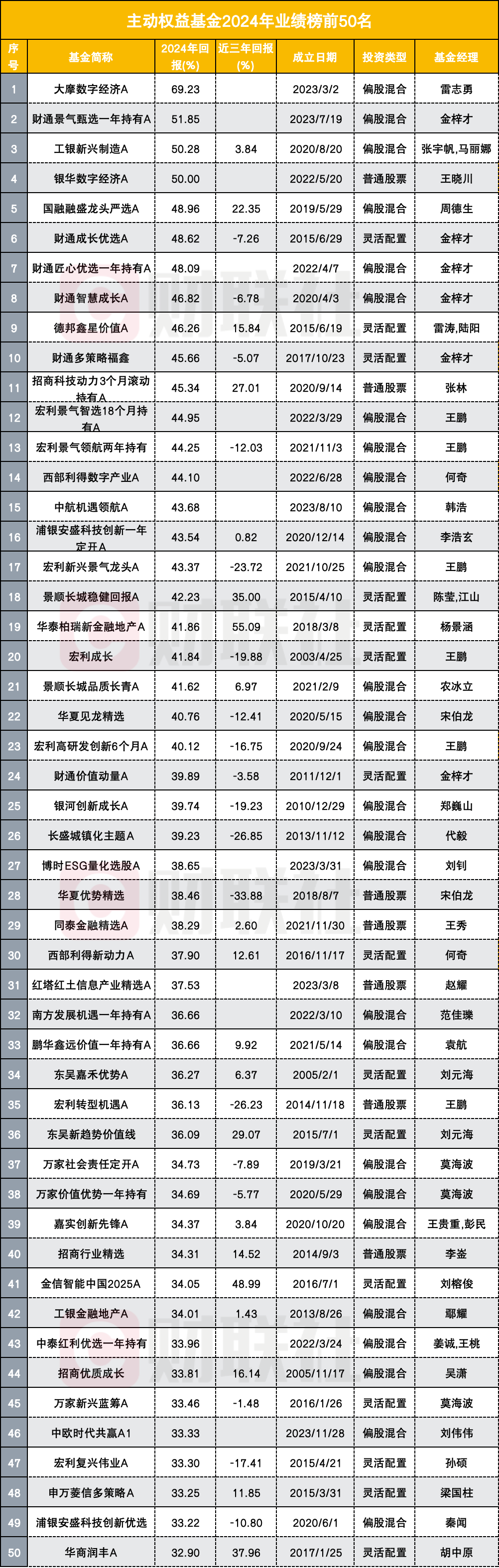 2024年度主动权益基金业绩排名呈现多个看点:一是雷志勇管理的大摩数字经济以69.23%的收益位居2024年主动权益基金业绩榜单冠军;二是金梓才管理的财通景气甄选一年、财通成长优选、财通匠心优选一年持有、财通智慧成长、财通多策略福鑫,这五只产品2024年净值收益率分别为51.85%、48.62%、48.09%、46.82%、45.66%,位列主动权益基金半年度业绩榜第二名和第六名、第七名、第八名、第十名。