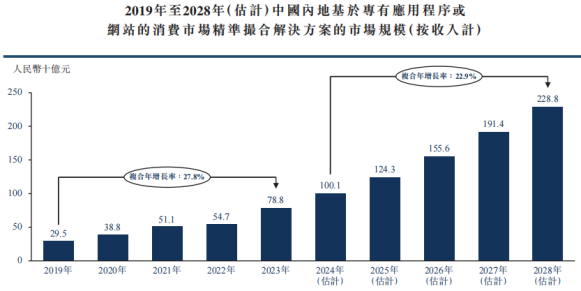 得益于包括电商产品及服务在内的第三产业的快速发展、AI与云计算等支持技术的发展和成熟,中国基于专有应用程序╱网站的消费市场精准撮合解决方案的市场正在经历高速发展期。弗若斯特沙利文数据显示,2019-2023年间市场规模复合年增长率达到27.8%,预计2028年市场规模将增至2288亿元。
