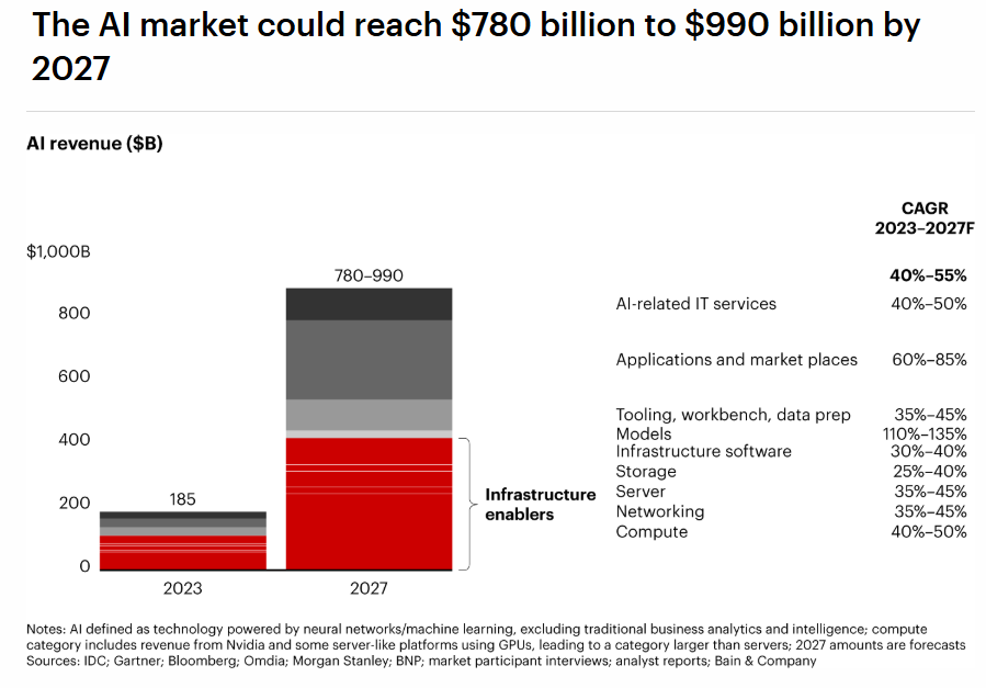 全球知名战略咨询公司贝恩预测,随着人工智能(AI)技术的迅速普及颠覆了企业和经济,人工智能相关的所有市场规模正在膨胀,到2027年将接近1万亿美元大关。这家全球顶级战略咨询公司在《全球技术报告》中指出,包括人工智能相关服务和AI GPU与AI ASIC等基础核心硬件在内的整体AI市场规模将在2023年1850亿美元的基础上,每年增长40%至55%。这意味着,到2027年将带来7800亿至9900亿美元的庞大收入。