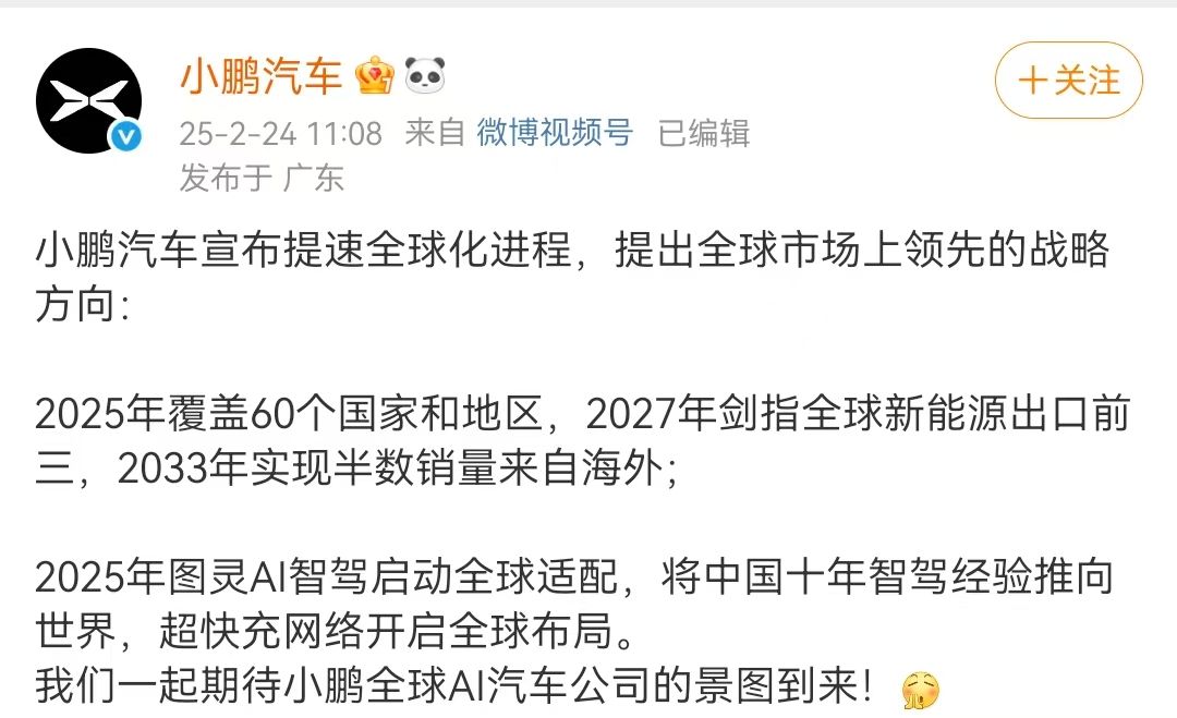 据小鹏汽车微博2月24日消息,小鹏汽车(09868)宣布提速全球化进程,提出全球市场上领先的战略方向:2025年覆盖60个国家和地区,2027年剑指全球新能源出口前三,2033年实现半数销量来自海外;2025年图灵AI智驾启动全球适配,将中国十年智驾经验推向世界,超快充网络开启全球布局。