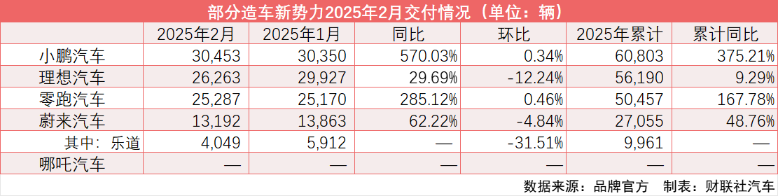 紧随其后的零跑汽车2月交付量为25,287辆,同比增长285.12%。与上述两家车企相同,零跑也在加快新品布局,以抢占更多的市场份额。2月21日,零跑新T03正式上市,定位为五门纯电车型,两个版本售价分别为5.99万元和6.99万元。此外,零跑B10也将在3月10日开启预售。 蔚来公司2月交付新车13,192辆,同比增长62.22%。其中,蔚来品牌交付新车9,143辆,同比增长12.4%;乐道品牌交付新车4,049辆。