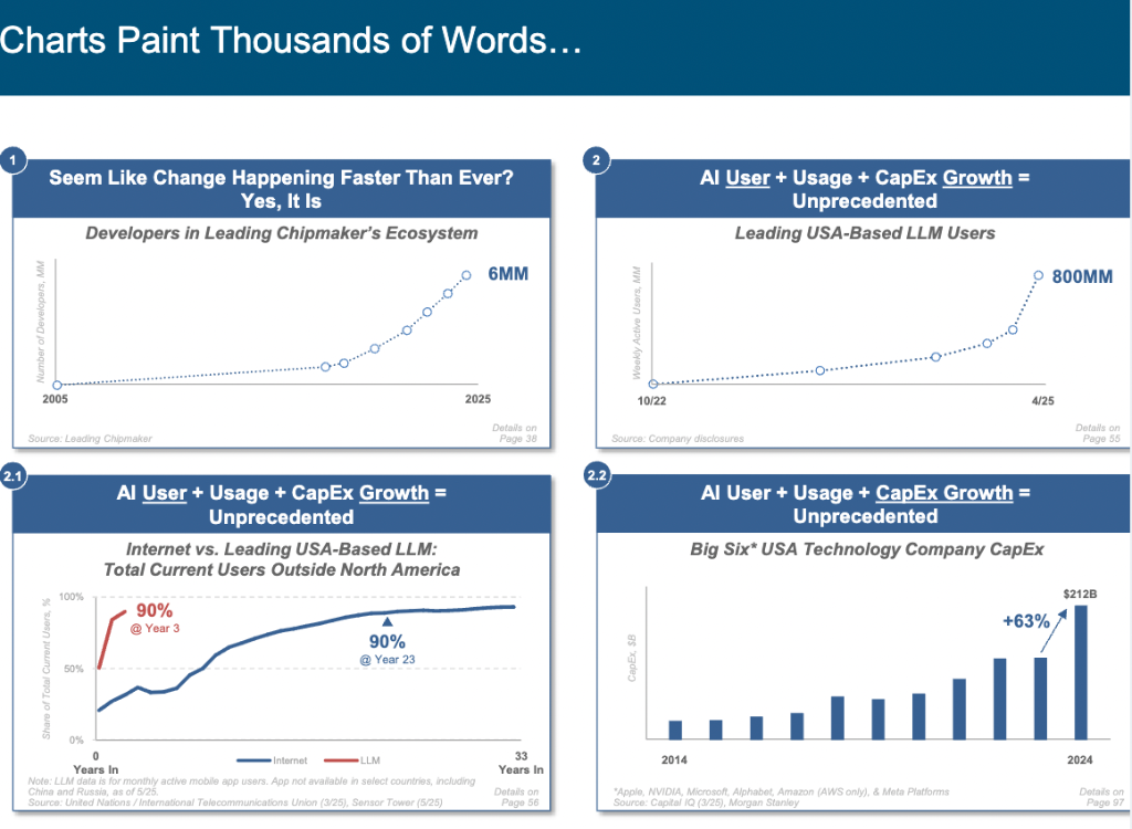 这份报告延续了Meeker一贯的宏大视野,从印刷术发明到Roomba扫地机器人应用无所不包,试图为AI时代描绘全景图。报告指出,AI的发展速度前所未见,其用户增长、使用量和资本支出均呈现出爆炸式增长,正在深刻改变全球互联网格局和工作方式。