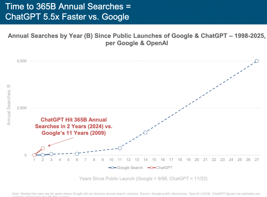 ChatGPT还在蚕食搜索市场份额,其年度搜索量已经达到3650亿次,是谷歌的5.5倍。但这种史无前例的普及速度,也意味着竞争的白热化程度同样史无前例。