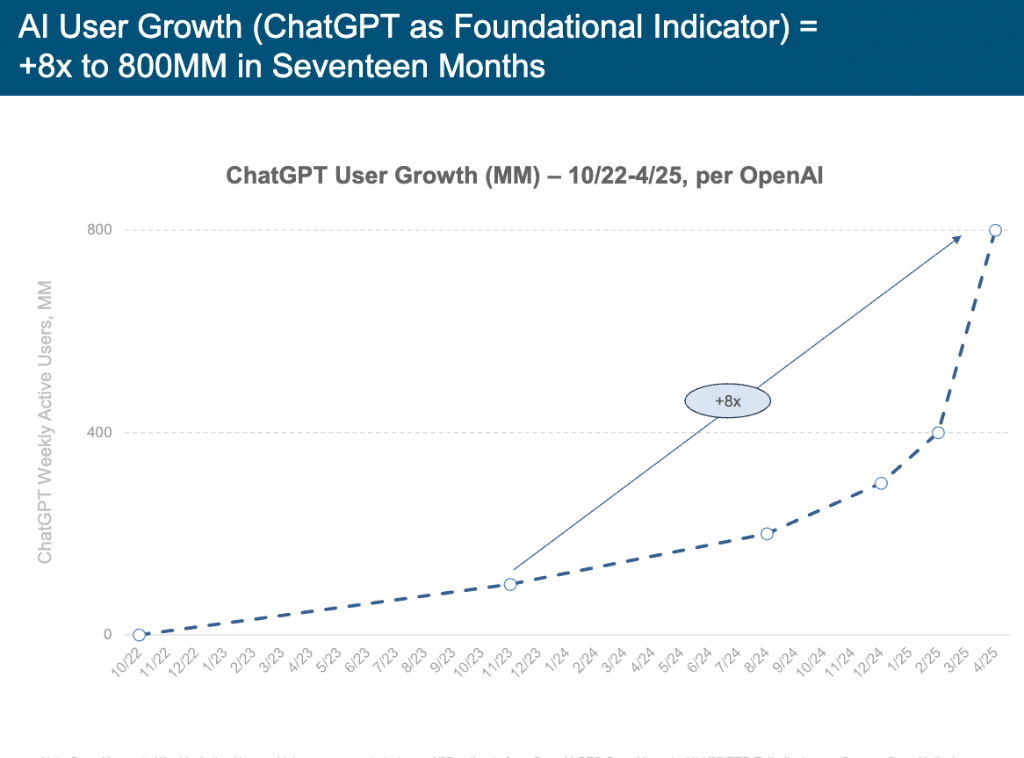 比如,ChatGPT在17个月内达到8亿用户,这个增长速度超越了人类历史上任何一项技术。