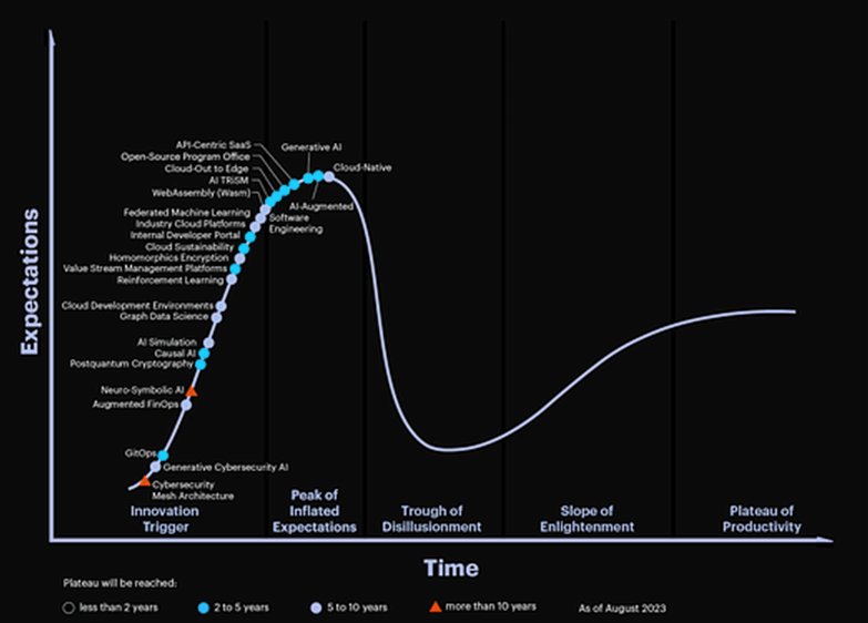 技术触发期(Innovation Trigger)、期望膨胀期(Peak of Inflated Expectations)、泡沫破灭谷底(Trough of Disillusionment)、稳步爬升期(Slope of Enlightenment)、生产成熟期(Plateau of Productivity)