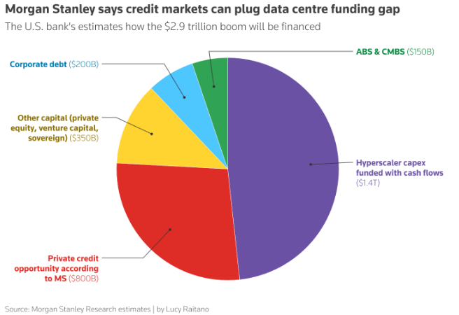 此类贷款提供了更大的灵活性,但在市场动荡期间可能更难交易,从而可能造成更大的金融市场压力。摩根士丹利估计,到 2028 年,私募信贷市场可以提供数据中心建设所需 1.5 万亿美元资金的一半以上。