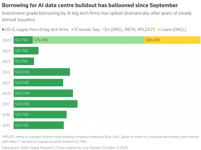 美国银行的数据显示,仅在9月和10月,专注于人工智能的大型科技公司就发行了 750 亿美元的美国投资级债券,是2015年至2024年间该行业平均每年发行量 320 亿美元的两倍多。债券发行包括来自Meta(META.US)的 300 亿美元和来自甲骨文(ORCL.US)的 180 亿美元。此外,谷歌母公司 Alphabet(GOOGL.US)周一宣布了新借款。