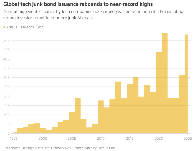 与人工智能相关的债券也开始出现在高收益债券市场,或者说是“垃圾级债券”市场,这类债券违约风险较高,但回报也较高。