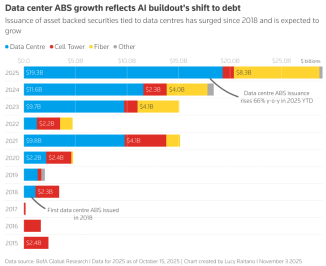 尽管数字基础设施仅占美国ABS市场(约1.6万亿美元)的5%(即800亿美元),但美国银行指出,该市场在不到五年的时间里增长了八倍多。据估计,数据中心支撑了该市场64%的份额,预计到明年年底,该市场规模将达到1150亿美元,主要驱动力是数据中心的建设。