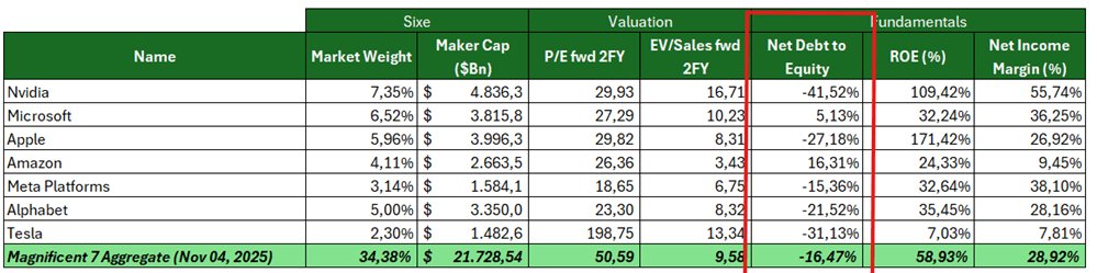 Mag7的净负债权益比已从10月24日的-22%降至当前的-16%。虽然净债务仍为负值,因此总流动性仍然大于债务,但两者之间的差距正在缩小,这不是一个好兆头。由此可见,科技公司正在支出资金或增加债务,用于人工智能相关的资本支出。该数值越接近于零(或变为正值),系统就越会从“现金充裕”转变为“杠杆化”。