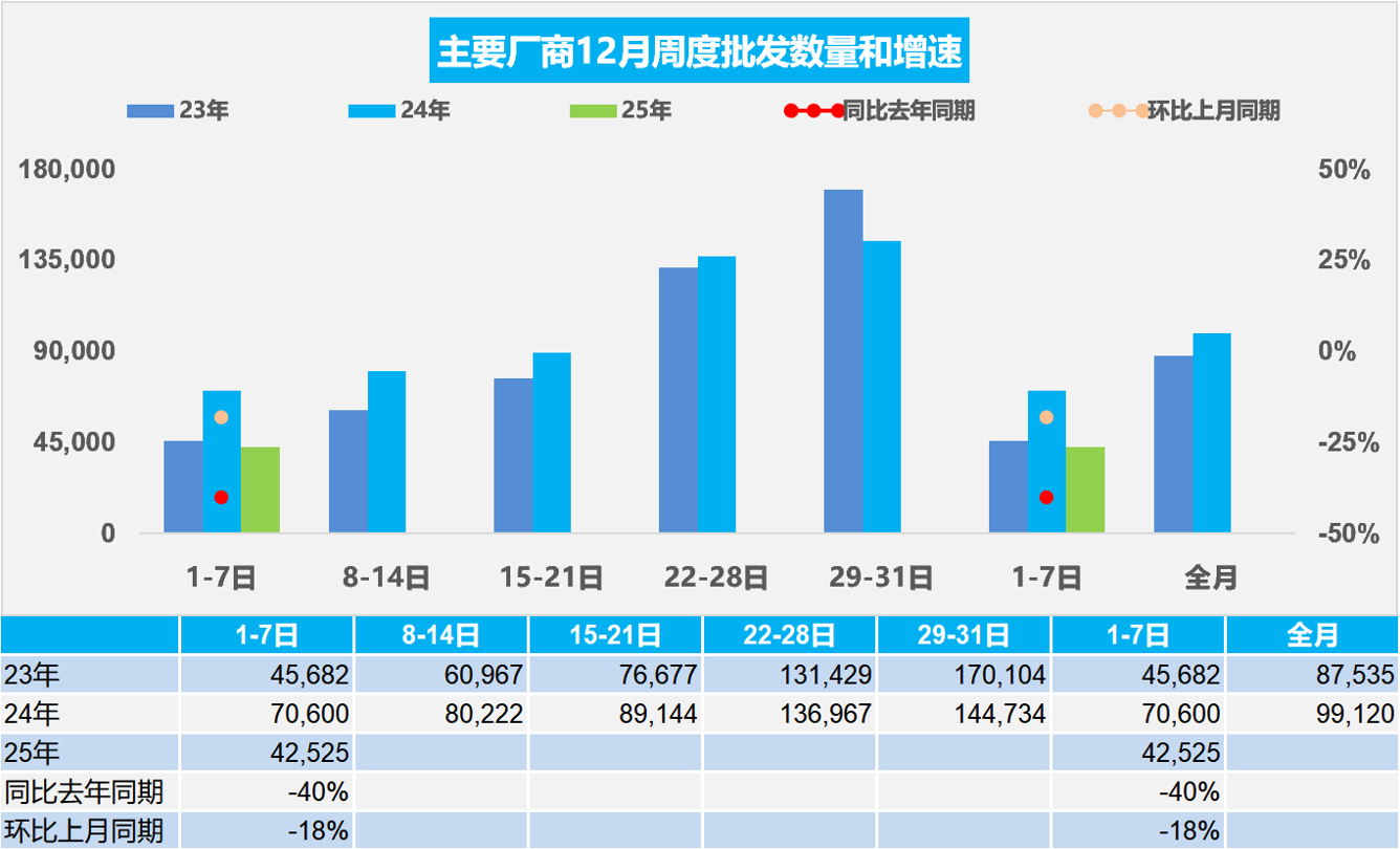 2025年12月共有23个工作日,较去年同期多一天,较11月的20个工作日多3天,12月生产销售时间相对充裕。12月第一周厂商批发销量相对缓慢,主要是11月零售偏弱,目前的零售回暖慢于预期,连续两个月的渠道库存增长较快,经销商在月初极其谨慎的进车。而2024年12月的市场热情超强,连续的去库存导致经销商去年年末库存较低,经销商进货更加主动积极,推动第一周批发暴增。今年12月相对2023年12月第一周的表现也是稍低的。