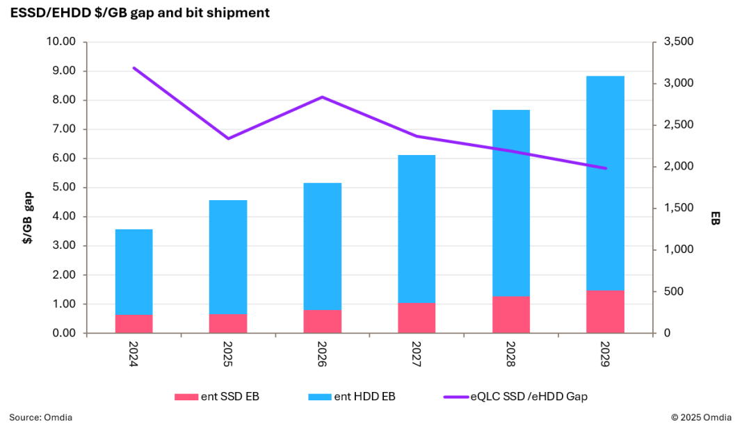 3. Omdia认为2026年是QLC ESSD的转折点——并非因为其将作为HDD的替代品,而是由于AI推理应用创造了极具吸引力的使用场景。HDD凭借经验证的可靠性和成本优势,仍是大规模近线存储的首选,承载数据中心超80%的数据容量。尽管当前NAND行业发展迅速,其扩张速度在未来十年内仍无法实现HDD的大规模替代。Omdia预计到2029年QLC ESSD与EHDD的成本差距将达6倍。