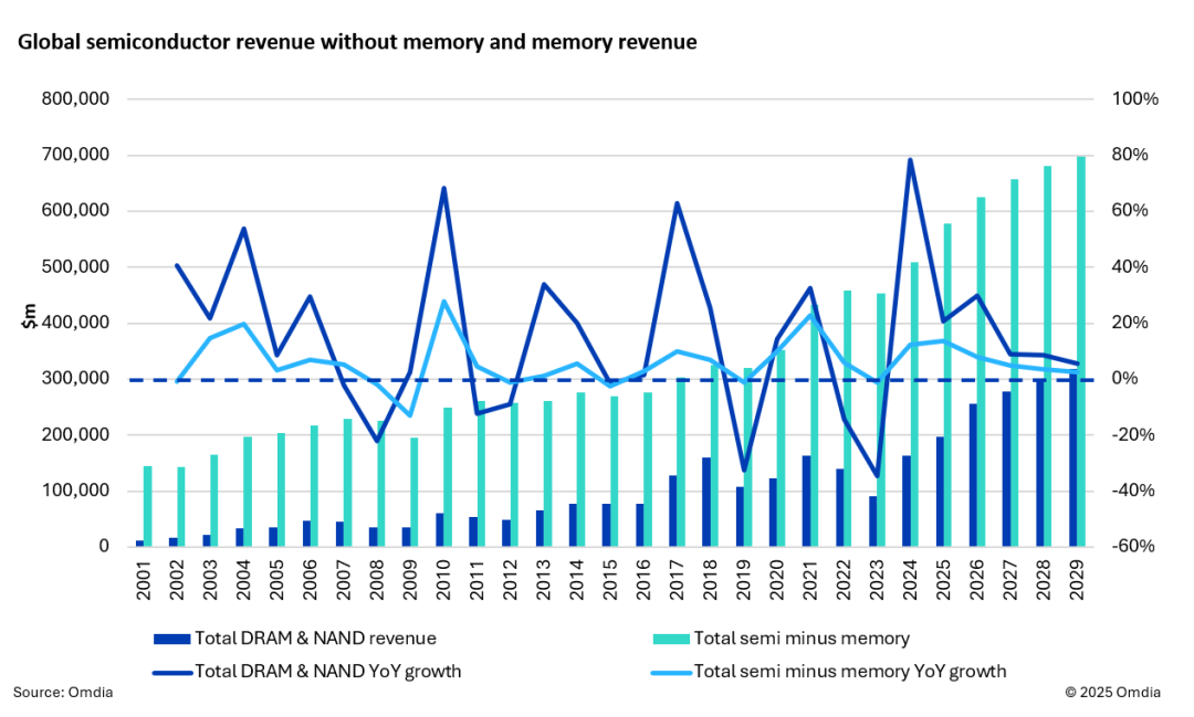 Omdia发文称,一直以来,存储产品市场约占半导体总营收的25%,而其供需与价格历来呈现高度波动的特点。这一市场的增长态势,通常对半导体整体营收格局有着显著影响。如在2000年代初期,DRAM——作为存储产品市场中规模最大的品类——曾实现唯一一次连续三年的同比增长。此后二十余年间,DRAM市场仅出现过三次营收连续两年增长的情形。