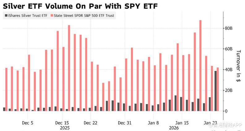 这一成交规模几乎与全球最大ETF之一,道富环球旗下的SPDR标普500 ETF相当,同时也超过了英伟达(NVDA.US)股票约230亿美元的成交额,以及特斯拉(TSLA.US)约220亿美元的单日换手水平,凸显市场对白银资产的追逐已进入异常火热阶段。