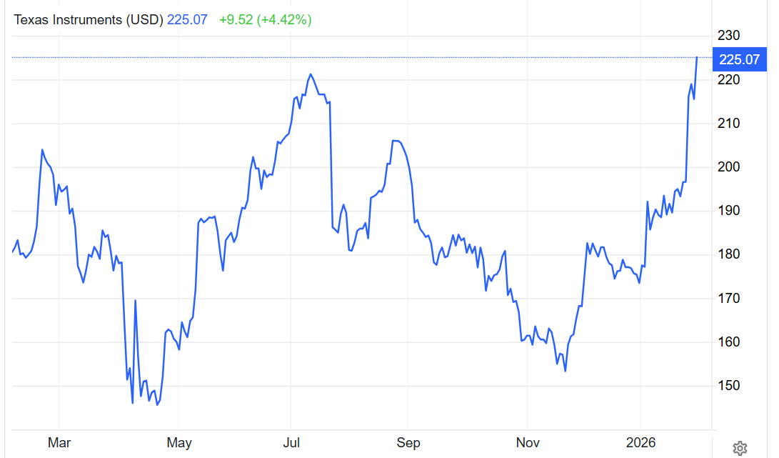 随着德州仪器以及意法半导体等模拟芯片巨头公布强劲业绩前景,史无前例AI浪潮之下AI训练/推理带来的堪称“无止境”芯片需求可谓从AI芯片与存储芯片顺利传递至模拟芯片端,带动德州仪器(TXN.US)今年以来股价已经大涨超30%,其中1月27日公布强劲业绩数据以来,德州仪器股价已经大涨超15%且在周一创下历史新高点位。