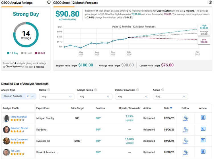 在即将公布2026财年第二季度财报之际,华尔街对思科股票的共识评级为“强烈买入”,该评级基于11个“买入”评级和3个“持有”评级。思科股票的平均目标价为90.80美元。思科股票的股息收益率为2.1%。