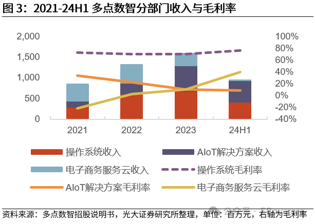 AIoT解决方案毛利率提升有望驱动公司实现盈利。根据公司招股说明书,24H1公司实现营收9.4亿元,同比增长22.9%,零售核心服务云收入占比99.4%,其中操作系统和AIoT解决方案收入占比分别为44.7%和54.7%。24H1公司毛利率38.3%,其中操作系统毛利率高达76.8%,由于前期劳务成本较高,AIoT业务毛利率仅9%。公司预计随着AIoT解决方案的成熟,三年内AIoT业务成本会稳定在较低水平,驱动公司整体毛利率的提升。