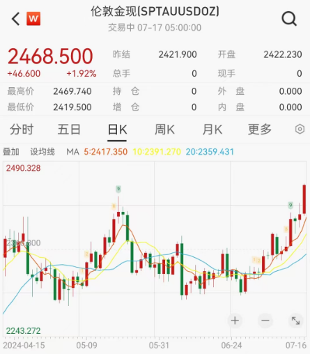 今年3月开始,黄金开启主升浪,3月6日创出历史新高后一路快速突破2200、2300、2400美元大关。在4月中旬至6月2300~2400美元充分震荡整理后,7月金价再迎攻势。北京时间7月17日5时,纽约商品交易所COMEX黄金期货合约报收在2473.6美元/盎司,突破再创历史新高。伦敦现货黄金也同样创出历史新高报2468.5美元/盎司。