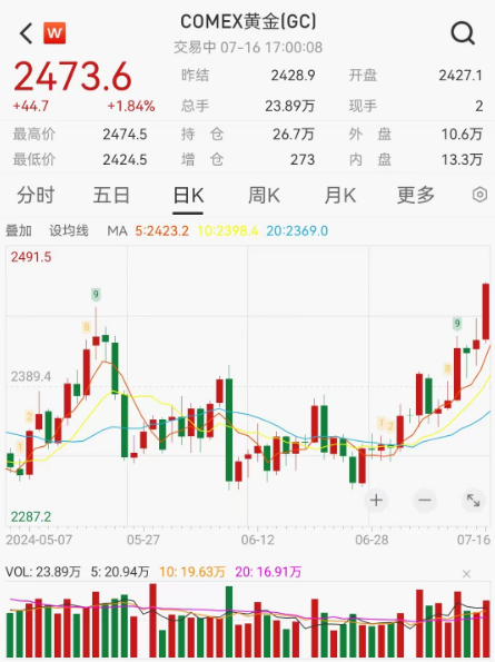 经过两个多月横盘整理,7月黄金再度开启升势。截至北京时间7月17日5时收盘,COMEX黄金、伦敦现货黄金纷纷突破再创历史新高。后期还有动力继续上涨?