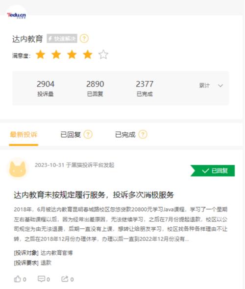 11月1日,《港湾商业观察》于黑猫投诉平台发现“达内教育”共拥有2904条投诉量,其中2377条投诉已完成。有多名消费者投诉达内教育存在“诱导贷款、虚假宣传、违规收费”等问题,要求公司退款或赔偿精神损失费。