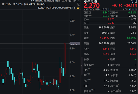 中概股普遍上涨,拍明芯城涨43.45%,小牛电动涨26.11%,蔚小理大涨。