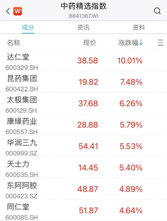 中药板块午后继续走强,达仁堂拉升封板,昆药集团涨超7%,昆药集团、华润三九、康缘药业、太极集团等十余股涨超5%。